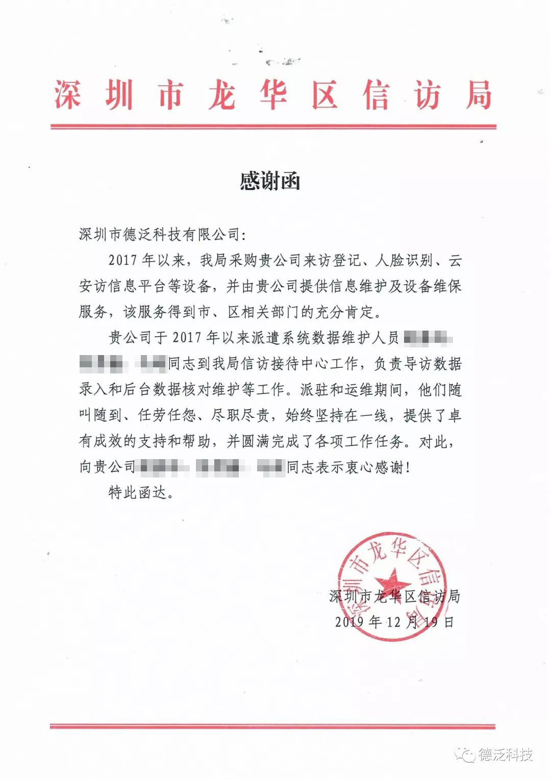 近期,德泛科技陸續(xù)收到了來自深圳市信訪局、深圳市退役軍人事務(wù)局等職能部門的表揚信(感謝函)。深圳市信訪局的表揚信講到:“德泛科技在云安訪信息平臺項目中出色的完成了領(lǐng)導(dǎo)交辦的各項任務(wù),得到了領(lǐng)導(dǎo)的充分肯定與來訪群眾的一致好評?!?/p>