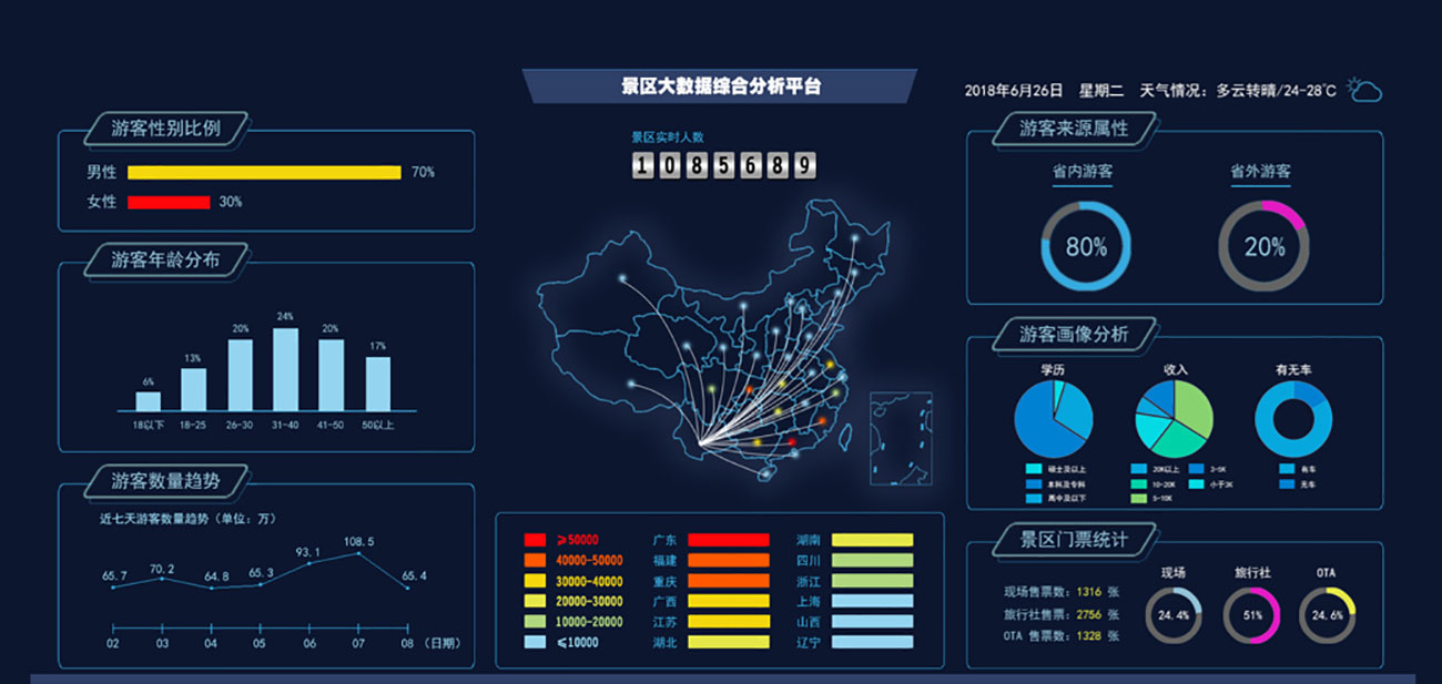智慧景區(qū)運(yùn)營(yíng)管理平臺(tái)通過(guò)智能化設(shè)備、數(shù)據(jù)分析和云計(jì)算等技術(shù),為景區(qū)提供全方位的管理和運(yùn)營(yíng)支持。對(duì)景觀資源、自然環(huán)境、景區(qū)客流、停車(chē)管理、基礎(chǔ)設(shè)施運(yùn)維等管理領(lǐng)域的關(guān)鍵指標(biāo)進(jìn)行綜合監(jiān)測(cè)分析,實(shí)現(xiàn)景區(qū)、人、事、物統(tǒng)一管理??苫跉v史客流數(shù)據(jù),結(jié)合專(zhuān)業(yè)的預(yù)測(cè)模型,設(shè)定客流閾值實(shí)現(xiàn)超限自動(dòng)報(bào)警,為景區(qū)管理者進(jìn)行流量控制、人流疏導(dǎo)、安全保障等工作提供有力支持??芍庇^展示景區(qū)文物資源、建筑景觀、自然景觀等資源的類(lèi)型、數(shù)量、空間分布等,深化細(xì)化管理部門(mén)對(duì)景觀資源的監(jiān)管和維護(hù)水平,為景區(qū)功能區(qū)規(guī)劃提供決策依據(jù)。 支持對(duì)綠地、植被、水域等環(huán)境要素位置分布、面積等進(jìn)行可視化監(jiān)測(cè),對(duì)景區(qū)天氣、水質(zhì)、溫濕度、空氣質(zhì)量等數(shù)據(jù)進(jìn)行實(shí)時(shí)監(jiān)測(cè)分析,提高防御自然災(zāi)害的能力,為環(huán)境保護(hù)提供決策支持。 對(duì)景區(qū)人員、車(chē)輛通行情況、車(chē)位使用情況、人員密度等信息進(jìn)行實(shí)時(shí)可視化監(jiān)測(cè),可顯示景區(qū)各停車(chē)場(chǎng)車(chē)位狀況,為車(chē)輛指揮、停車(chē)資源合理規(guī)劃提供決策依據(jù);集成各類(lèi)前端感知設(shè)備采集的實(shí)時(shí)數(shù)據(jù),對(duì)突發(fā)事件的發(fā)生地、實(shí)時(shí)態(tài)勢(shì)、處置情況等信息進(jìn)行可視化監(jiān)測(cè),方便指揮人員進(jìn)行判定分析,幫助管理者實(shí)時(shí)掌握景區(qū)人流、車(chē)流態(tài)勢(shì)。為突發(fā)事件提供決策支持,提高景區(qū)管理人員對(duì)突發(fā)事件處理效率。